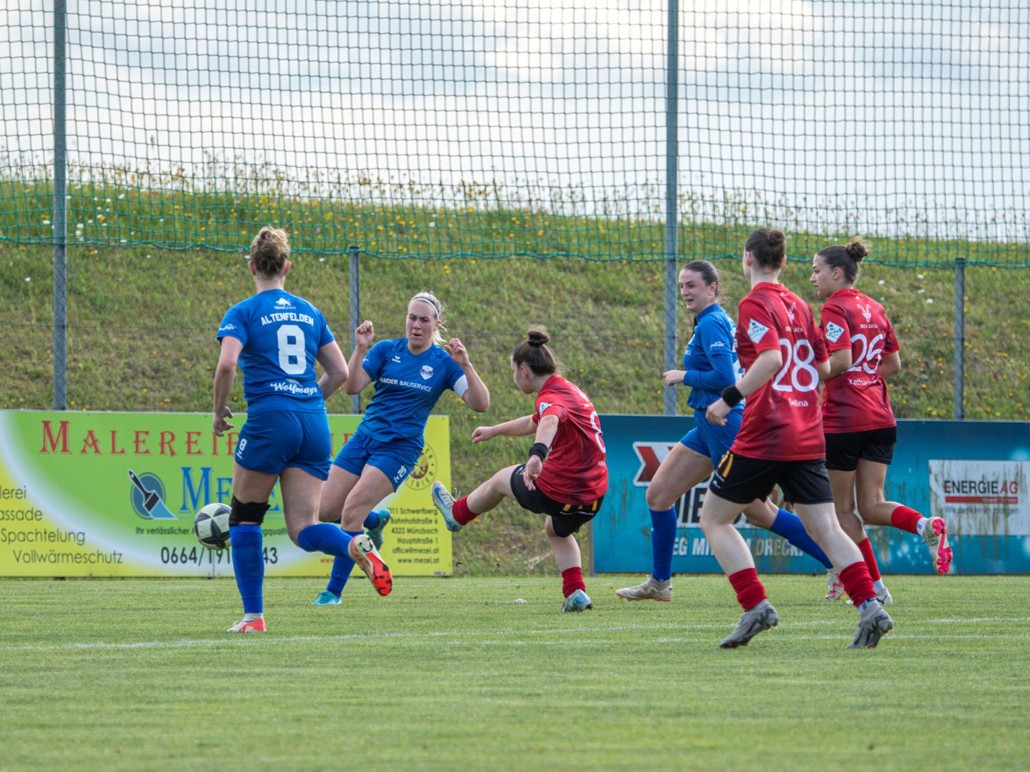 Miray Dedecan (3. von links, roter Dress) traf zum zwischenzeitlichen Ausgleich (1:1) und hielt damit auch das Torjägerinnen-Duell mit Höglinger "pari" (beide Fotos: Willi Grinninger, kickerin.at)