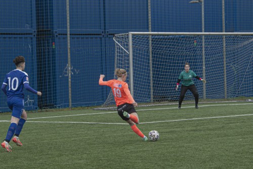 Alice Meuer (Bildmitte, Nummer 19 ) nimmt wieder einmal Maß..... (alle Fotos: Willi Grinninger, kickerin.at)